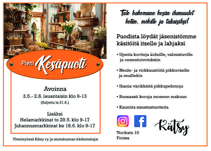 Kesällä 2025 pidettiin Torikadulla Pieni Kesäpuoti auki lauantaisin kesäkuusta elokuun alkuun. Meillä oli esillä noin 20 käsityöläisen tuotteet.