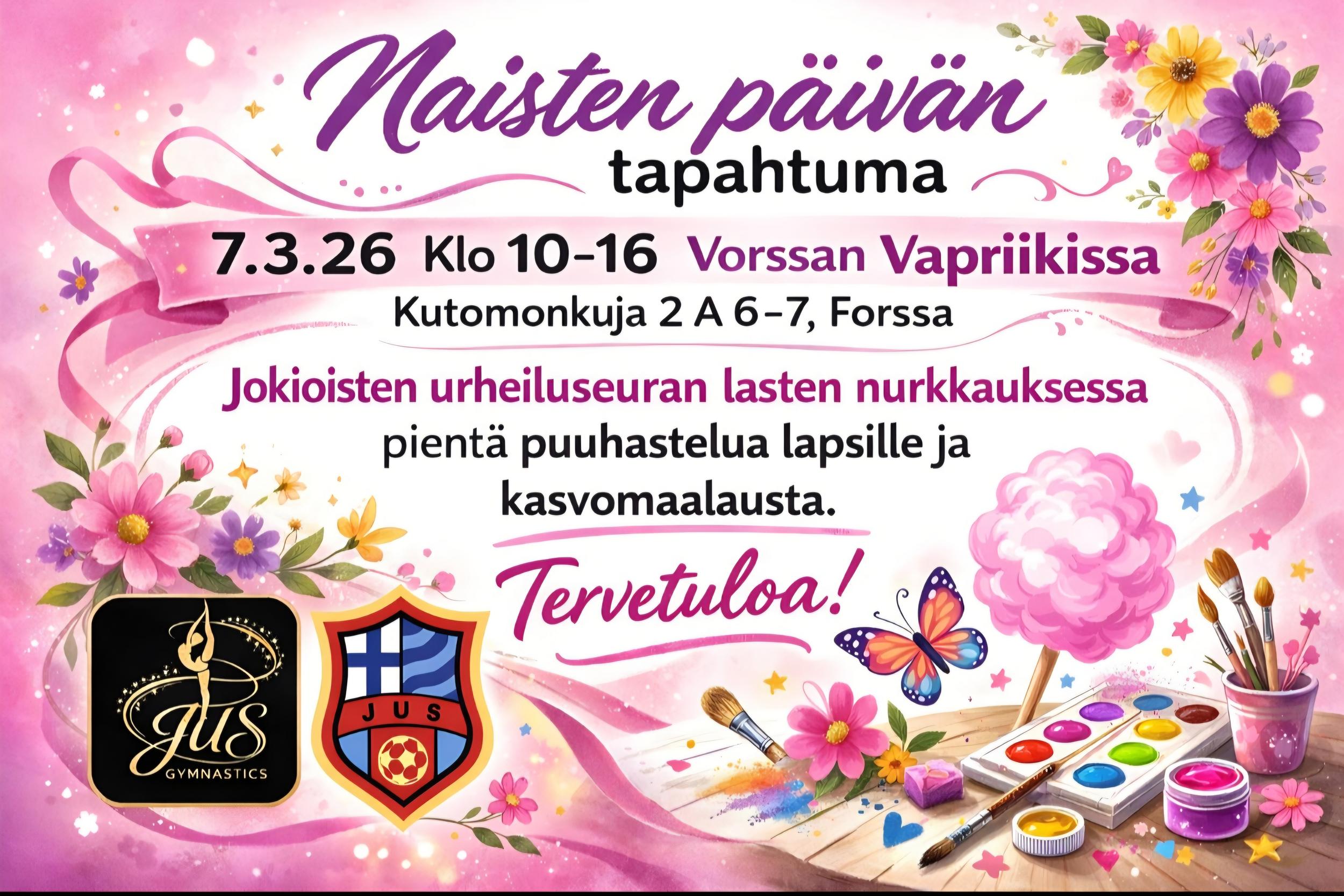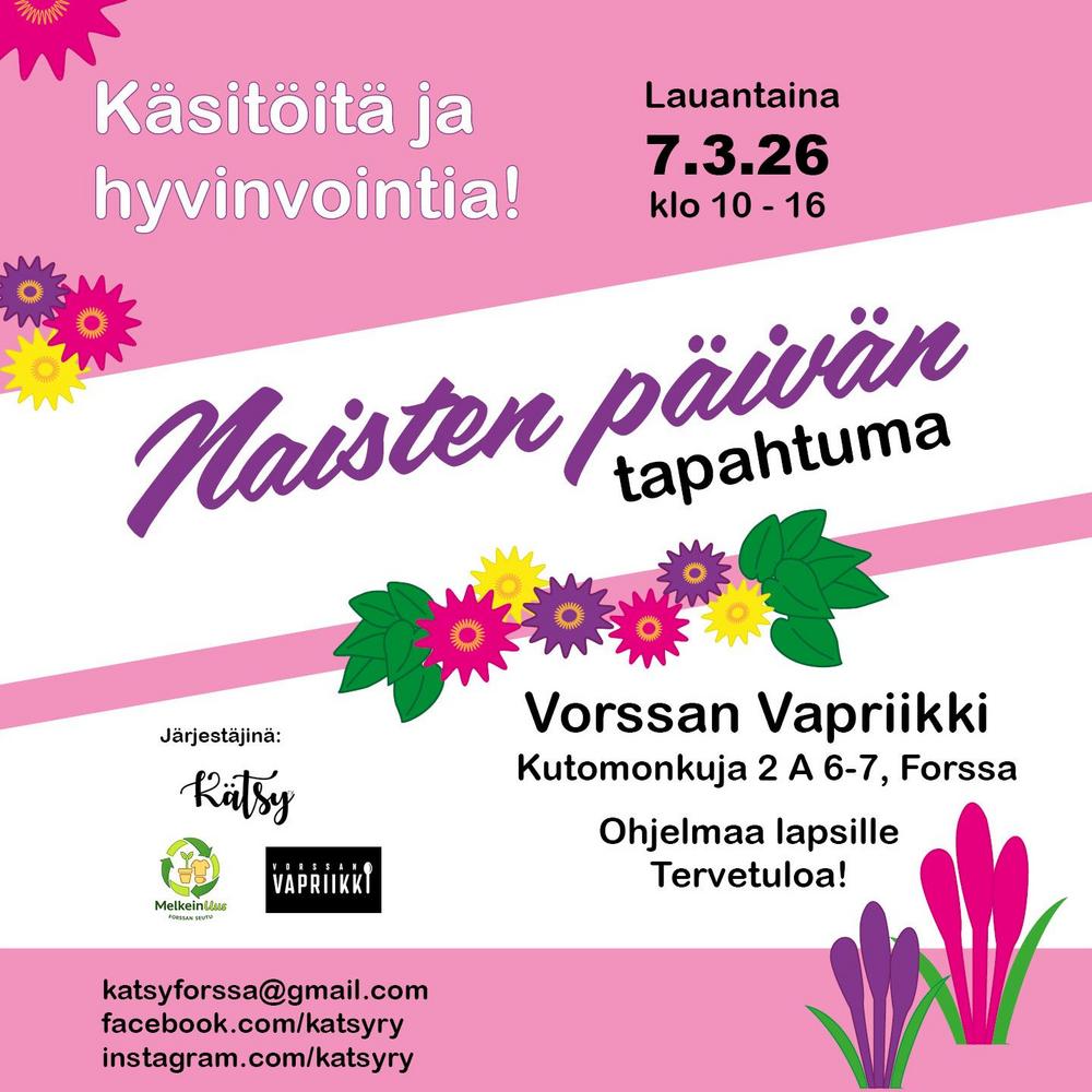 NaistenPäivä tapahtuma on 7.3.26 klo 10-16 Vorssan Vapriikilla. Esillä on käsitöitä, hyvinvointia ja kaikenlaisia herkkuja.
